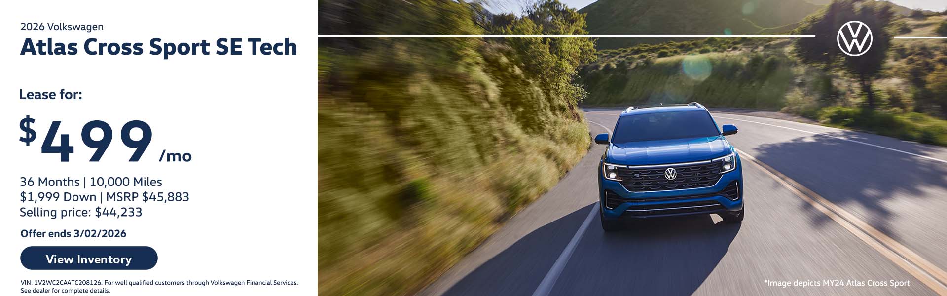 For 36 months and 10,000 miles. $1,999 Down. MSRP: $45,883. VIN: 1V2WC2CA4TC208126. $1,999 due at signing. For highly qualified customers through Volkswagen Financial Services. See dealer for details.